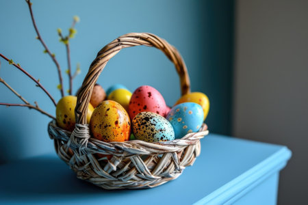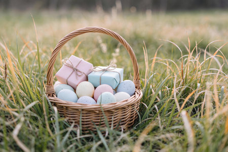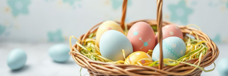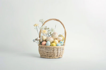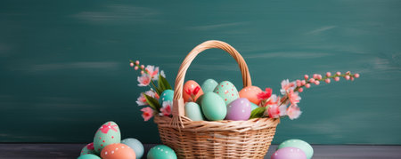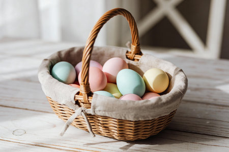 A charming wicker basket filled with pastel-colored Easter eggs, ready for a springtime celebration.