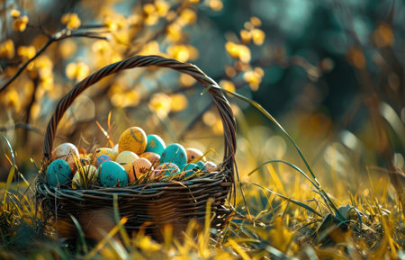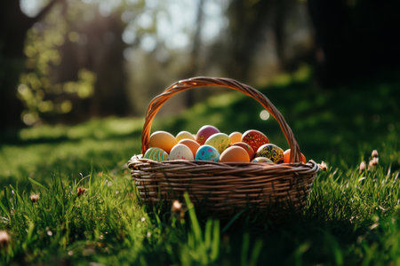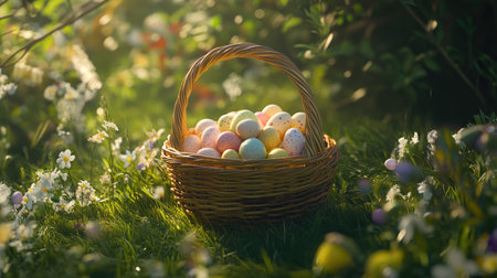 A basket full of colorful Easter eggs rests on a bed of lush green grass, with the warm glow of spring sunshine illuminating the scene.