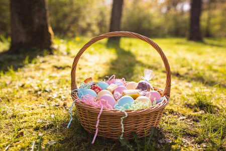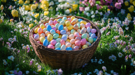 A woven basket overflows with pastel-colored Easter eggs and wrapped sweets, nestled in lush green grass under dappled sunlight