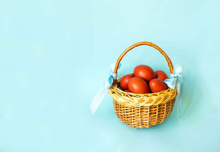 Wicker basket decorated with blue ribbons with brown Easter eggs on a light blue background. Easter greeting card. Minimal concept. Flat lay. Copy space.