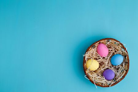 Easter eggs basket on blue background
