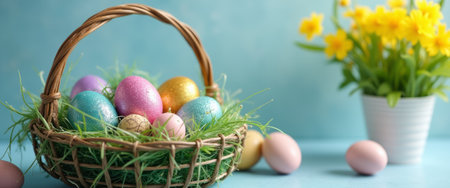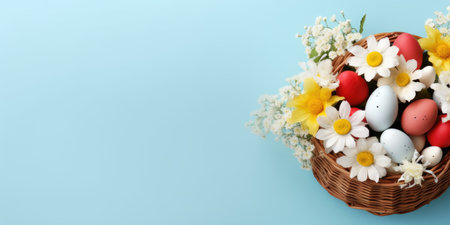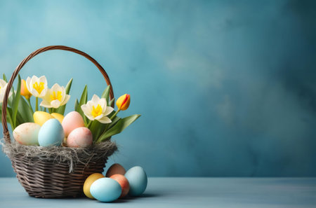 A charming woven basket brimming with vibrant Easter eggs rests on a soft blue background, accompanied by a cheerful bouquet of yellow flowers. This delightful scene captures the essence of springtime festivities, evoking feelings of joy and renewal as the colorful eggs symbolize hope and new beginnings.