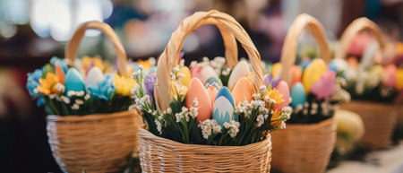 Colorful Easter eggs and flowers arranged in baskets on a festive table ,.,