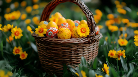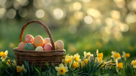 A charming wicker basket filled with Easter eggs rests in a field of blooming daffodils, capturing the essence of springtime joy.