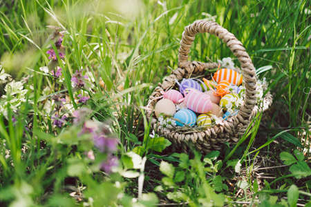 Colorful easter eggs in basket on green grass outdoor. Easter background concept. egg hunt.
