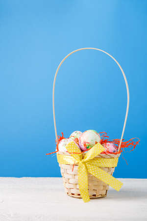 Basket with Easter colorful eggs on yellow blue background. Happy Easter concept
