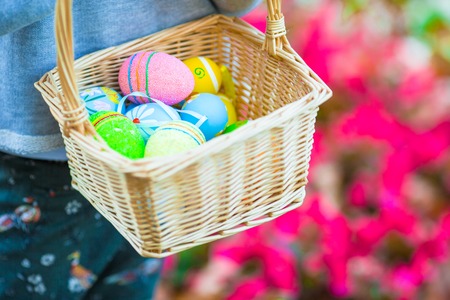 Person holding a wicker basket of colorful Easter eggs. Realistic style on a nature background. Concept of Easter celebration