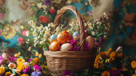 A beautifully arranged basket filled with decorated eggs is surrounded by an explosion of fresh flowers. The vibrant colors and floral patterns embody the spirit of Easter and renewal.