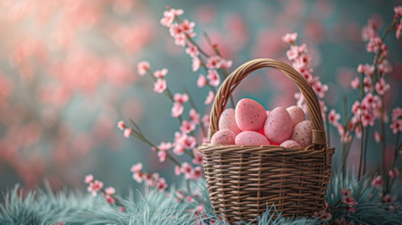 Easter Eggs in a Wicker Basket Surrounded by Pink Flowers in a Field