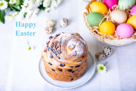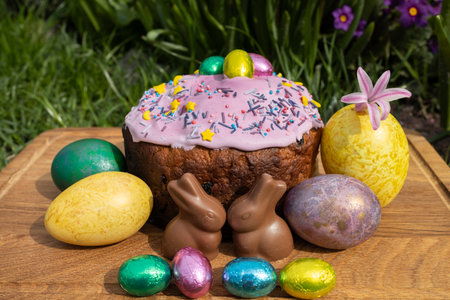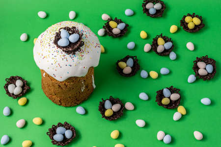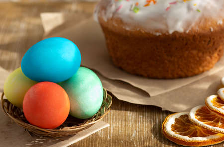 Traditional Slavic Easter cake decorated with sprinkles. Colored chicken eggs. Spring celebration event.