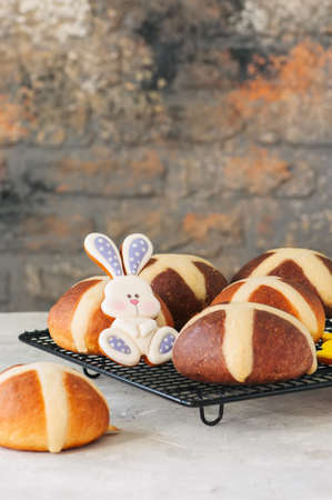 Chocolate and classic hot cross buns on a white stone background. Copy space.