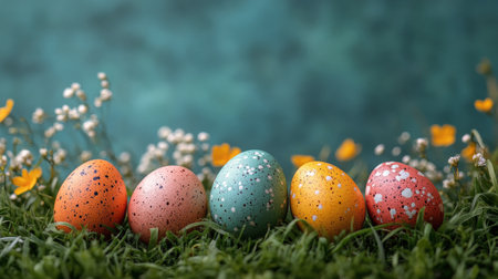 A vibrant collection of colorful Easter eggs nestled among delicate flowers in a sunny spring meadow, evoking a sense of joy and celebration.