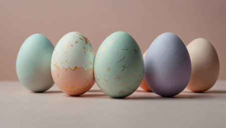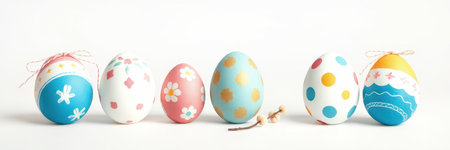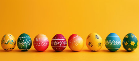 Colorful decorated eggs arranged in a row for a festive spring celebration in a bright setting