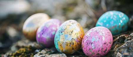 Vibrant decorated Easter eggs rest on rocky ground showcasing various colors and patterns in natural light during springtime.