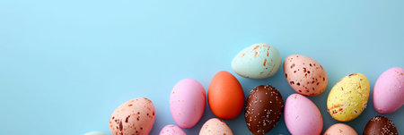 Colorful easter eggs on blue background, panoramic shot