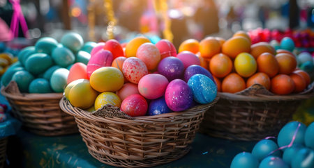 Colorful Easter eggs in rustic baskets. A vibrant spring display, symbolizing new life and joy.