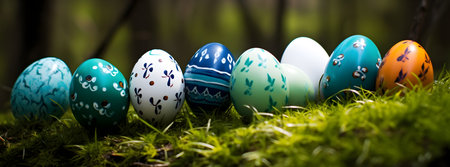 Colorful painted Easter Eggs with various patterns on blue teal Background. Banner with copy space. Ideal for Easter promotions, spring events, holiday greetings, advertisements, festive content.