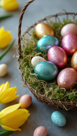 A charming basket brimming with glittering Easter eggs in pastel hues sits atop a soft gray surface, surrounded by cheerful yellow tulips. This delightful scene captures the essence of spring and celebration, inviting joy and warmth into any festive gathering.