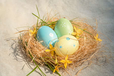 Easter eggs in the nest. Nest with yellow spring flowers and Easter eggs on the table