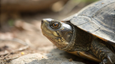 portrait of freshwater pond turtle with yellow stripes and brown shell, on the rocks near the pond,