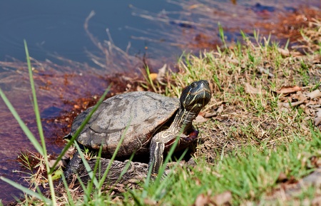 Red Eared Terrapin - Trachemys scripta elegans. Red eared slider turtle in the summer sunlight.