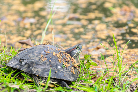 Turtle is sunbathing on the green leaf in a lake, wildlife scene from Dalat, Vietnam. The amphibian animal in the nature habitat. Royalty high-quality free stock image of animal. Wildlife photography.
