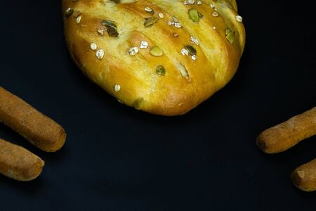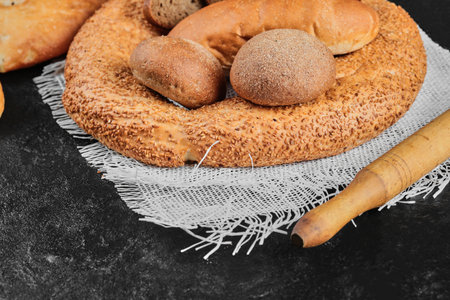 Different types of fresh bread with grain on a black rustic background. the bread stands around on top position. Top views with clear space