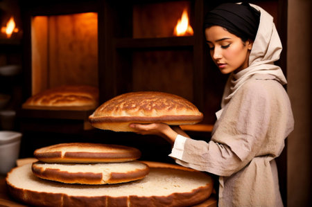 A skilled baker arranges freshly baked loaves in woven baskets near a glowing stone oven.