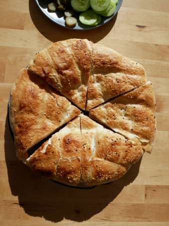 Freshly baked flat bread in the style of turkish ramadan pide on a kitchen board, selected focus, narrow depth of field