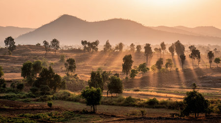 Experience a peaceful landscape where soft sunlight beautifully illuminates trees and rolling hills, capturing the essence of nature