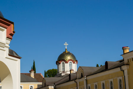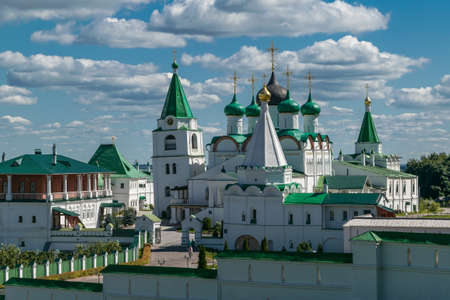 View at Pechersky ascension monastery white clear Sunny day. Is a Church with a bell tower and gold domes. The monastery is surrounded by white stone walls. In the sky, floating Cumulus clouds.