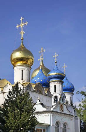 Golden and blue domes with crosses. Orthodox church. Dormition cathedral in Trinity Lavra of St. Sergius, Sergiyev Posad, Russia