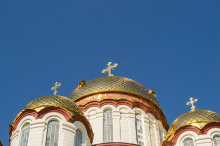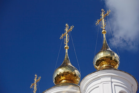 The houses are gold and silver with Orthodox crosses against a blue sky on a bright day, close-up. Old traditional architecture of Russia