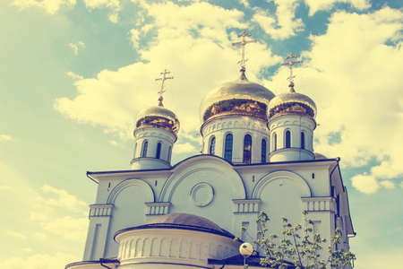 Golden domes of Christianity orthodox cathedral. Image with vintage filter