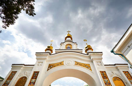 Arch with golden domes at Kiev Pechersk Lavra Christian complex against cloudy sky.