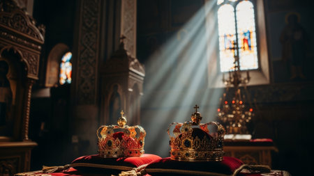 Royal crowns on velvet cushions in church, light rays stream through stained glass.