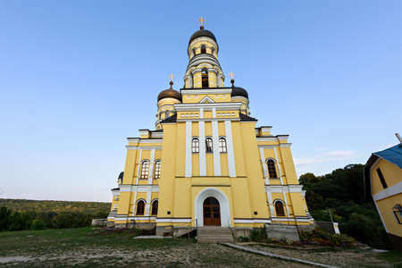 A beautiful yellow church in central park. Welcome to Gagauzia, Moldova. Comrat city center. Background with copy space for text or lettering