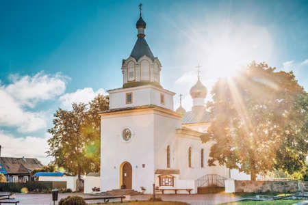 Mir, Belarus. Orthodox Church Of The Holy Trinity In Sunrise Sunrays. Famous Landmark