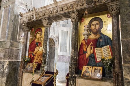 Athens - May 6, 2018: Inside an old Orthodox church in Athens, Greece. Dark vintage interior of the Greek church. View of saint icons and altar with cross. The dilapidated ancient church.