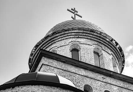 The Orthodox church is white against the sky, a dark dome on top stands a golden cross, a belfry with bells. high quality photo