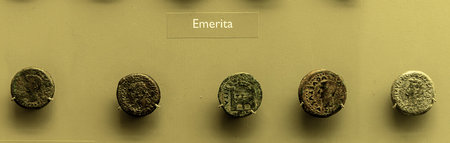Collection of ancient coins from Emerita on display at the Merida Museum, Spain, showcasing the numismatic history and cultural significance of this Roman city.