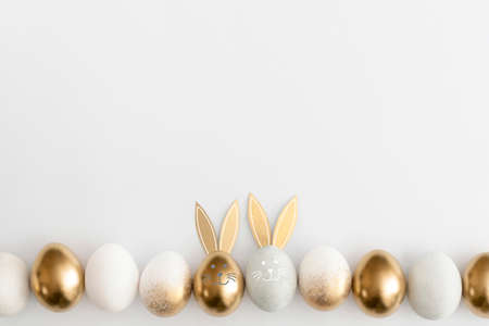 Golden eggs with bunny face and space for text on a white background. Minimal easter concept.