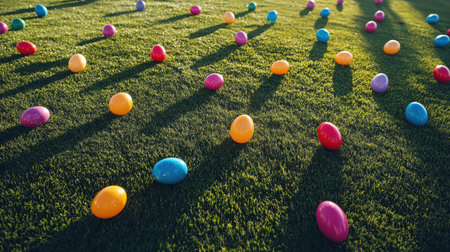 Brightly colored plastic Easter eggs scattered across a neatly trimmed lawn