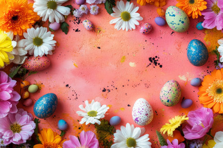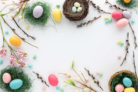 Top down view of Easter decorations arranged in a border with copy space in the middle.