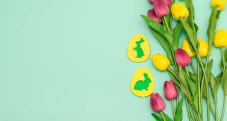 Bouquet of yellow and purple tulips with easter fabric eggs with bunny prints on light green background. Easter frame with copy space on green background. copy space.
