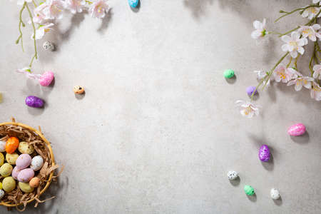 Overhead view of Easter chocolate eggs and flowers holiday concept