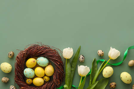 Composition with beautiful Easter eggs and tulip flowers on green background