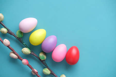 Colorful background with frame, Easter eggs on blue background. Happy Easter concept. Can be used as poster, background, holiday card. Flat lay, top view, copy space. Studio Photo