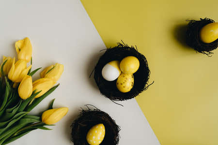 Spring Holiday Card Concept with Floral Arrangement. Flat lay of Easter eggs, spring flowers, and decorative nest on yellow background, greeting card concept with bright festive design