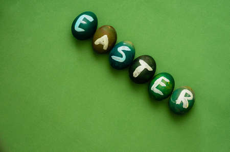 Easter inscription on green dyed eggs. Monochromatic composition